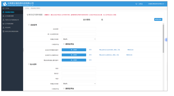 在此页面按要求填写上传相关材料,并完成付款。云南壹证通CA将在当天办理CA并邮寄。客服电话400-004-0628(紧急服务热线19988166369)